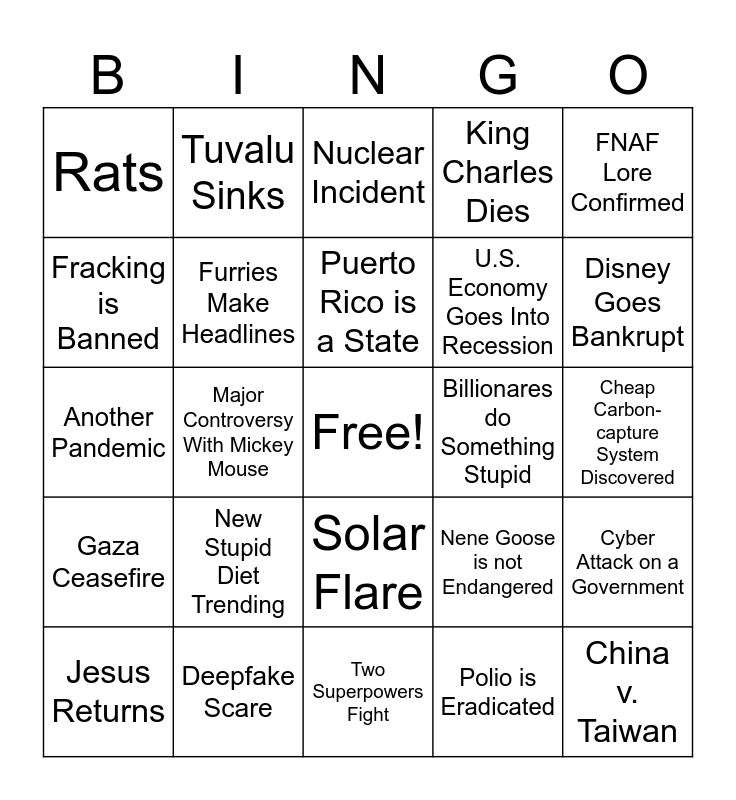 This bingo card has a free space and 27 words: Nene Goose is not Endangered, Major Earthquake, U.S. Economy Goes Into Recession, Two Superpowers Fight, Fracking is Banned, Nuclear Incident, Tuvalu Sinks, Gaza Ceasefire, Billionares do Something Stupid, Cyber Attack on a Government, Another Pandemic, King Charles Dies, Jesus Returns, Deepfake Scare, Disney Goes Bankrupt, Outer Space Accident, Furries Make Headlines, Puerto Rico is a State, New Stupid Diet Trending, Rats, Cheap Carbon-capture System Discovered, Polio is Eradicated, Major Controversy With Mickey Mouse, China v. Taiwan, Solar Flare, FNAF Lore Confirmed and World Leader Assassinated.
