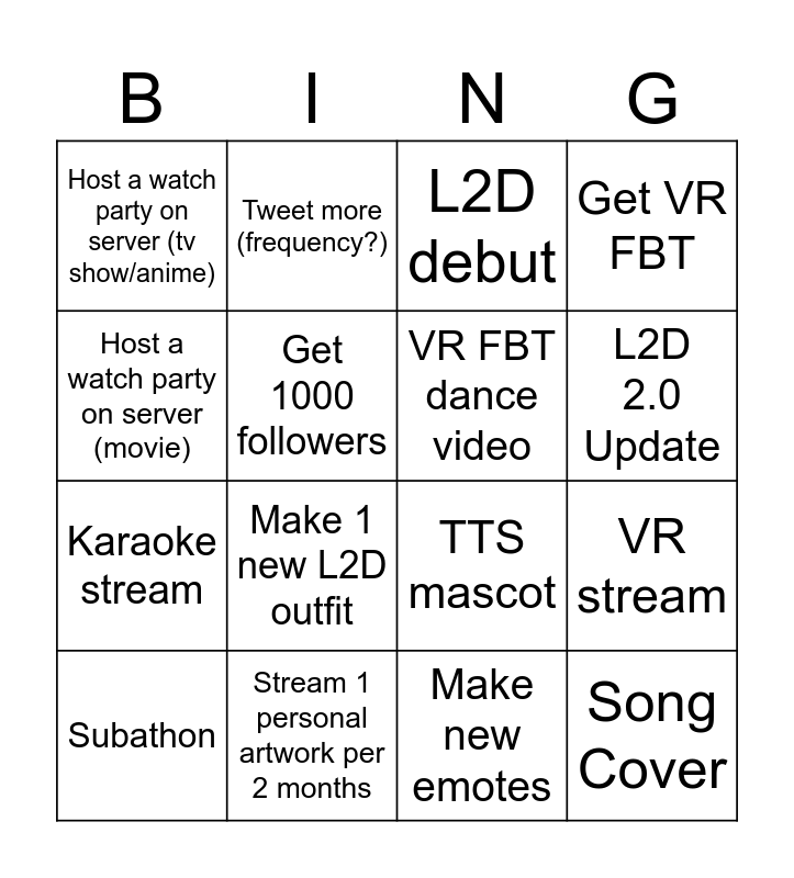 This bingo card has 16 words: Stream 1 personal artwork per 2 months, VR stream, L2D debut, Host a watch party on server (tv show/anime), Karaoke stream, Tweet more (frequency?), TTS mascot, Make new emotes, Host a watch party on server (movie), Get 1000 followers, Subathon, Get VR FBT, Make 1 new L2D outfit, L2D 2.0 Update, VR FBT dance video and Song Cover.