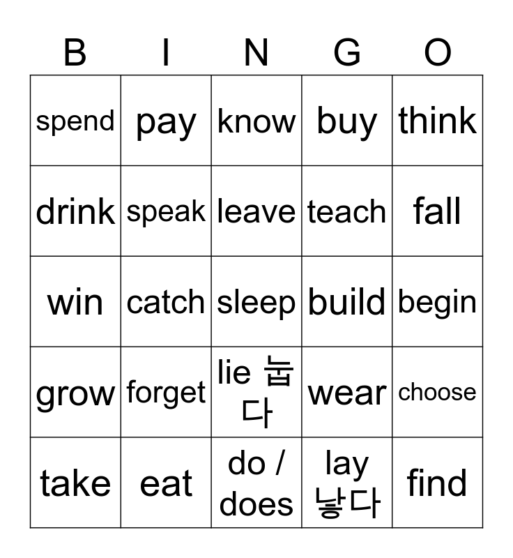 This bingo card has 38 words: read, come, write, speak, choose, forget, leave, feel, think, teach, catch, buy, sleep, begin, drink, grow, fly, know, give, build, spend, eat, fall, take, am / are / is, do / does, find, have, hear, lose, make, lie 눕다, lay 낳다, pay, see, wear, win and understand.