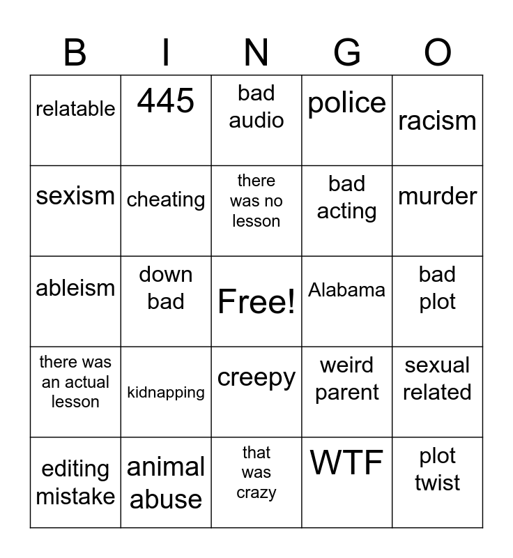 This bingo card has a free space and 24 words: kidnapping, animal abuse, there was no lesson, editing mistake, racism, relatable, sexism, 445, Alabama, creepy, bad acting, ableism, weird parent, sexual related, cheating, WTF, bad plot, bad audio, murder, down bad, plot twist, there was an actual lesson, police and that was crazy.