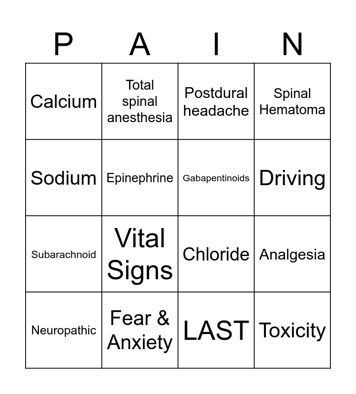This bingo card has 16 words: Fear & Anxiety, Analgesia, Postdural headache, Calcium, Subarachnoid, Total spinal anesthesia, Chloride, LAST, Sodium, Epinephrine, Neuropathic, Spinal Hematoma, Vital Signs, Driving, Gabapentinoids and Toxicity.