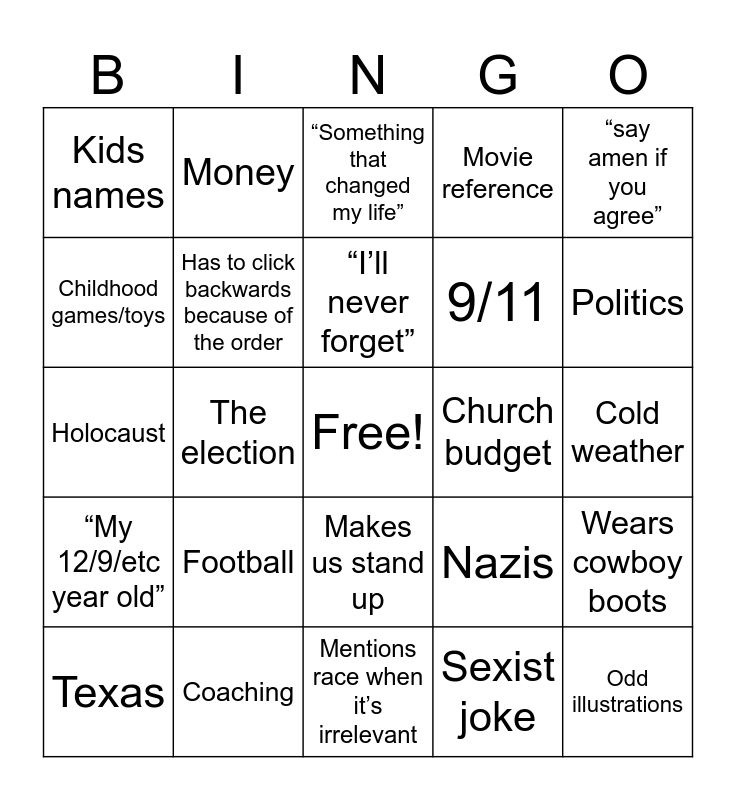This bingo card has a free space and 24 words: Football, Coaching, “I’ll never forget”, Texas, “say amen if you agree”, Kids names, Childhood games/toys, Money, Church budget, Makes us stand up, 9/11, Holocaust, Nazis, Wears cowboy boots, Has to click backwards because of the order, Sexist joke, Cold weather, “Something that changed my life”, Politics, The election, Odd illustrations, “My 12/9/etc year old”, Movie reference and Mentions race when it’s irrelevant.