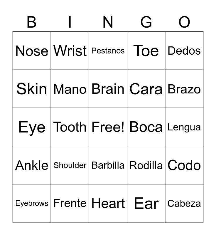 This bingo card has a free space and 24 words: Shoulder, Frente, Brain, Eyebrows, Dedos, Nose, Skin, Wrist, Boca, Barbilla, Cara, Eye, Rodilla, Codo, Mano, Ear, Lengua, Pestanos, Brazo, Tooth, Cabeza, Ankle, Toe and Heart.