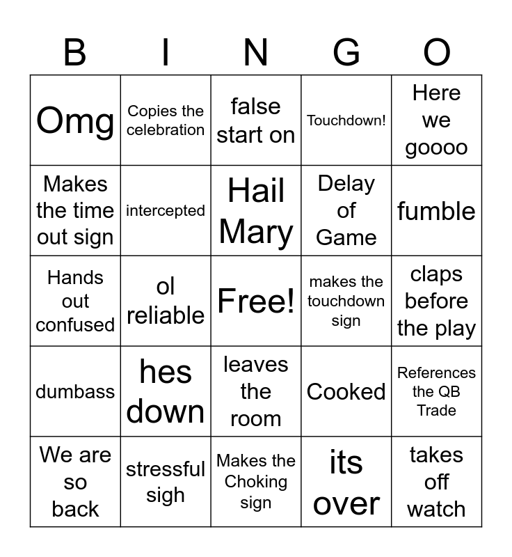 This bingo card has a free space and 29 words: We are so back, Jumps up off the couch, ol reliable, bullshit call, Omg, false start on, intercepted, hes down, makes the touchdown sign, stressful sigh, claps before the play, takes off watch, Makes the Choking sign, its over, fumble, stands closer to the tv, leaves the room, dumbass, Here we goooo, Hands out confused, Cooked, Uses the R word, Delay of Game, Makes the time out sign, Touchdown!, Copies the celebration, References the QB Trade, Hail Mary and "Refs put bets on the Lions".
