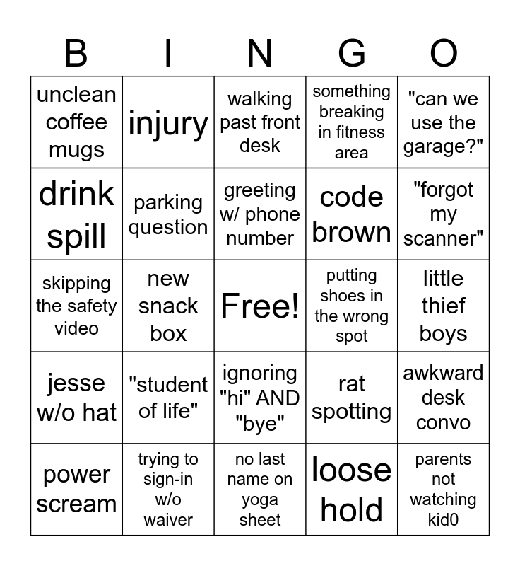 This bingo card has a free space and 24 words: "student of life", trying to sign-in w/o waiver, greeting w/ phone number, power scream, "can we use the garage?", unclean coffee mugs, drink spill, injury, putting shoes in the wrong spot, ignoring "hi" AND "bye", code brown, skipping the safety video, rat spotting, awkward desk convo, parking question, loose hold, little thief boys, walking past front desk, "forgot my scanner", new snack box, parents not watching kid0, jesse w/o hat, something breaking in fitness area and no last name on yoga sheet.