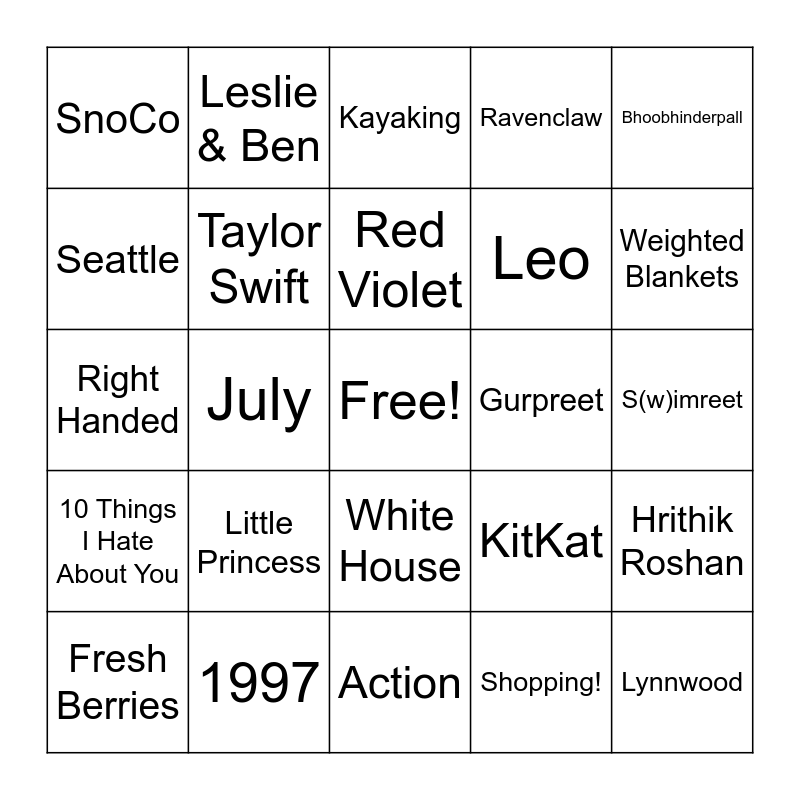 This bingo card has a free space and 50 words: Huskies, Lynnwood, SeattleU, Action, Little Princess, Brunch, Leslie & Ben, Sisters, Seattle, London, Taylor Swift, Ravenclaw, Hrithik Roshan, KitKat, Mercedes, Diljit Dosanjh, Red Violet, Gurpreet, Peonies, Bhoobhinderpall, July, Shopping!, SnoCo, Leo, Dash & Lilly, Sounders, Weighted Blankets, Scrabble, Kayaking, White House, Malibu, Apple Pie, Portugal & Spain, Din Tai Fung, 1997, Coffee, Summer, enfj, Wall - E, S(w)imreet, New Years Eve, Captain America, Evergreen, TJ, Fresh Berries, Right Handed, Angel, Blush, 10 Things I Hate About You and Emerald Cut.