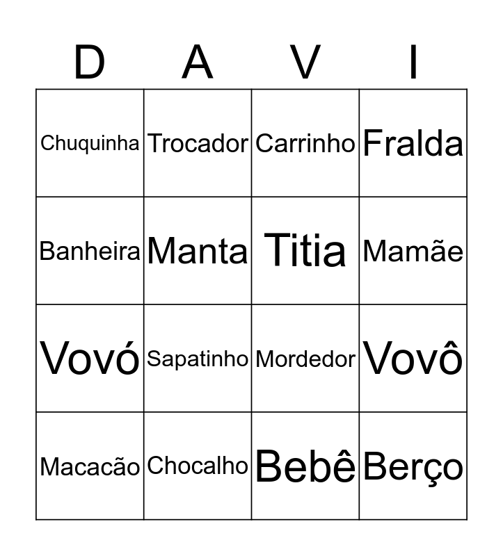 This bingo card has a free space and 26 words: Babador, Chupeta, Mamãe, Titio, Banheira, Chuquinha, Manta, Trocador, Bebê, Dinda, Vovó, Berço, Dindo, Papai, Vovô, Body, Fralda, Papinha, Carrinho, Macacão, Sapatinho, Davi, Chocalho, Mamadeira, Titia and Baby.
