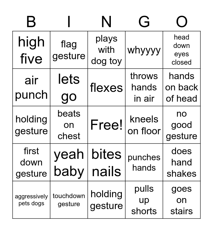 This bingo card has a free space and 24 words: yeah baby, touchdown gesture, flexes, aggressively pets dogs, head down eyes closed, high five, air punch, flag gesture, kneels on floor, bites nails, throws hands in air, holding gesture, punches hands, does hand shakes, lets go, pulls up shorts, no good gesture, plays with dog toy, hands on back of head, beats on chest, goes on stairs, first down gesture, whyyyy and holding gesture.
