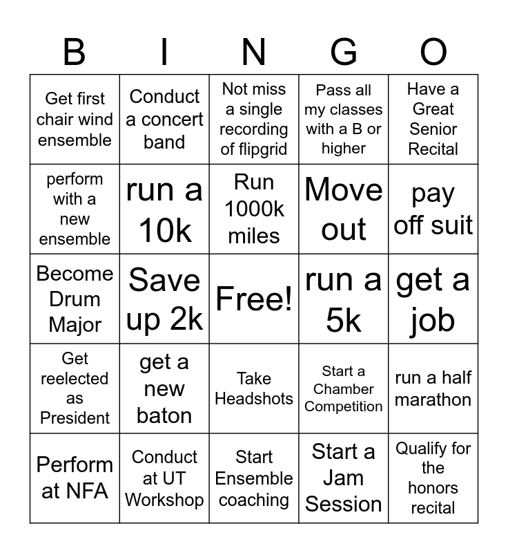 This bingo card has a free space and 24 words: Perform at NFA, get a new baton, Run 1000k miles, Start a Jam Session, Have a Great Senior Recital, Get first chair wind ensemble, Conduct a concert band, Not miss a single recording of flipgrid, run a 5k, get a job, Become Drum Major, run a 10k, Start a Chamber Competition, run a half marathon, perform with a new ensemble, Conduct at UT Workshop, Start Ensemble coaching, Pass all my classes with a B or higher, pay off suit, Get reelected as President, Save up 2k, Take Headshots, Move out and Qualify for the honors recital.
