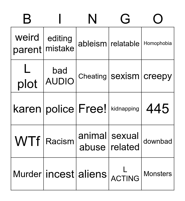 This bingo card has a free space and 24 words: Racism, incest, Cheating, Murder, Homophobia, weird parent, L plot, editing mistake, kidnapping, animal abuse, sexism, karen, sexual related, downbad, bad AUDIO, L ACTING, 445, ableism, creepy, police, Monsters, WTf, relatable and aliens.