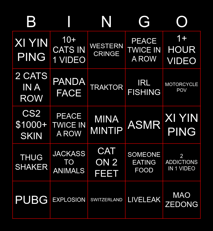 This bingo card has a free space and 24 words: JACKASS TO ANIMALS, EXPLOSION, TRAKTOR, PUBG, 1+ HOUR VIDEO, XI YIN PING, 2 CATS IN A ROW, 10+ CATS IN 1 VIDEO, ASMR, CAT ON 2 FEET, IRL FISHING, CS2 $1000+ SKIN, SOMEONE EATING FOOD, 2 ADDICTIONS IN 1 VIDEO, PANDA FACE, LIVELEAK, XI YIN PING, WESTERN CRINGE, MOTORCYCLE POV, PEACE TWICE IN A ROW, MAO ZEDONG, THUG SHAKER, PEACE TWICE IN A ROW and SWITZERLAND.