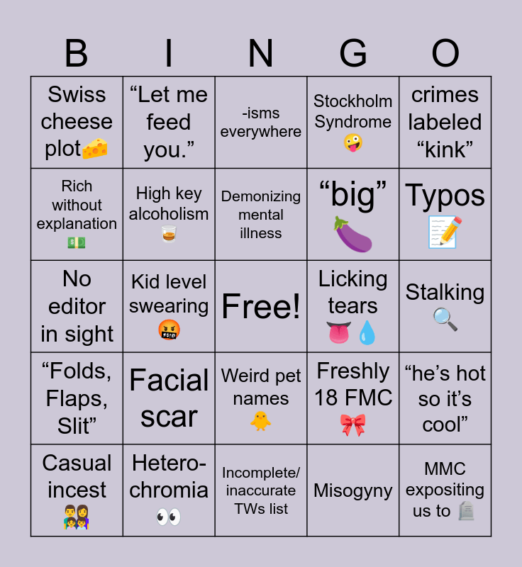 This bingo card has a free space and 24 words: Facial scar, Hetero- chromia π, Demonizing mental illness, Casual incest π¨βπ©βπ§βπ¦, crimes labeled βkinkβ, Swiss cheese plotπ§, Rich without explanation π΅, βLet me feed you.β, Licking tears π π§, Weird pet names π₯, βbigβ π, No editor in sight, Freshly 18 FMC π, βheβs hot so itβs coolβ, High key alcoholism π₯, Misogyny, Stalking π, -isms everywhere, Typos π, Kid level swearing π€¬, MMC expositing us to πͺ¦, βFolds, Flaps, Slitβ, Stockholm Syndrome π€ͺ and Incomplete/ inaccurate TWs list.