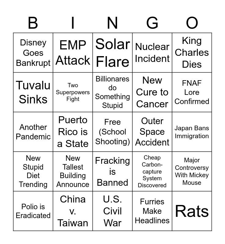 This bingo card has a free space and 35 words: Nene Goose is not Endangered, Major Earthquake, U.S. Economy Goes Into Recession, Two Superpowers Fight, Fracking is Banned, Nuclear Incident, Tuvalu Sinks, Gaza Ceasefire, Billionares do Something Stupid, Cyber Attack on a Government, Another Pandemic, King Charles Dies, Jesus Returns, Deepfake Scare, Disney Goes Bankrupt, Outer Space Accident, Furries Make Headlines, Puerto Rico is a State, New Stupid Diet Trending, Rats, Cheap Carbon-capture System Discovered, Polio is Eradicated, Major Controversy With Mickey Mouse, China v. Taiwan, Solar Flare, FNAF Lore Confirmed, World Leader Assassinated, Someone dies in the Elections, New Cure to Cancer, Japan Bans Immigration, Terrorist Attack Fails, U.S. Civil War, New Tallest Building Announce, EMP Attack and The Rail Derails.