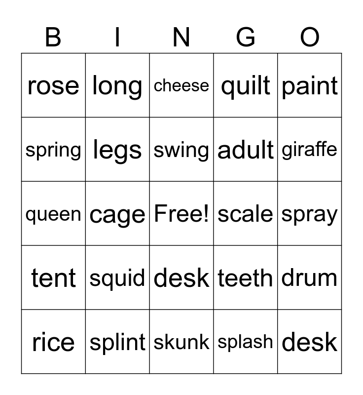 This bingo card has a free space and 29 words: rice, giant, cage, jeans, rose, cheese, legs, squid, scale, splint, spray, desk, skunk, splash, giraffe, orange, desk, tent, paint, queen, teeth, bank, adult, spring, quilt, long, drum, swing and phone.