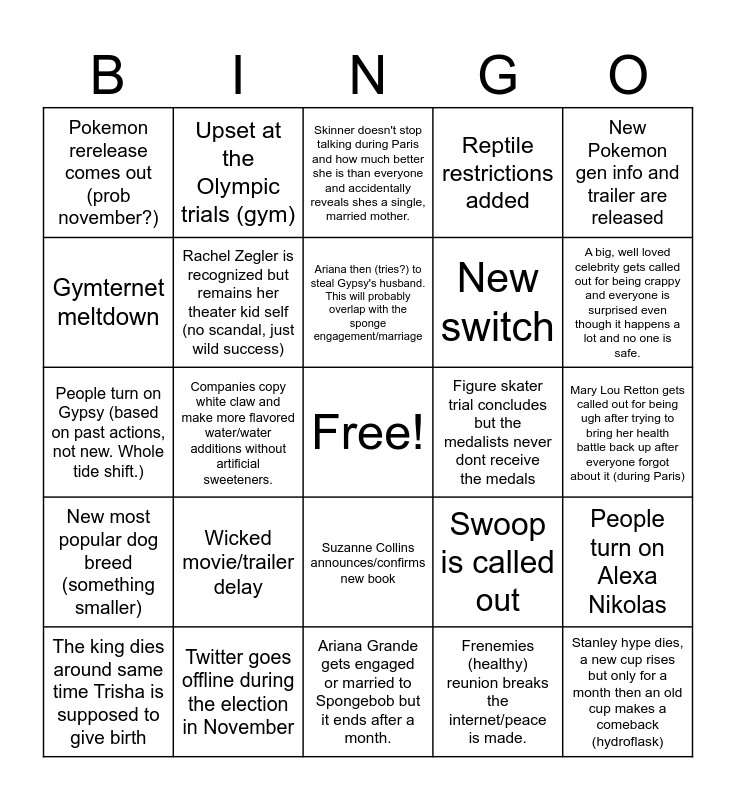 This bingo card has a free space and 25 words: Wicked movie/trailer delay, Ariana Grande gets engaged or married to Spongebob but it ends after a month., Ariana then (tries?) to steal Gypsy's husband. This will probably overlap with the sponge engagement/marriage, The king dies around same time Trisha is supposed to give birth, New Pokemon gen info and trailer are released, Pokemon rerelease comes out (prob november?), Gymternet meltdown, Upset at the Olympic trials (gym), Figure skater trial concludes but the medalists never dont receive the medals, Suzanne Collins announces/confirms new book, New switch, People turn on Gypsy (based on past actions, not new. Whole tide shift.), Swoop is called out, People turn on Alexa Nikolas, Rachel Zegler is recognized but remains her theater kid self (no scandal, just wild success), JK rowling doesn't stop talking, Mary Lou Retton gets called out for being ugh after trying to bring her health battle back up after everyone forgot about it (during Paris), Skinner doesn't stop talking during Paris and how much better she is than everyone and accidentally reveals shes a single, married mother., A big, well loved celebrity gets called out for being crappy and everyone is surprised even though it happens a lot and no one is safe., Companies copy white claw and make more flavored water/water additions without artificial sweeteners., Stanley hype dies, a new cup rises but only for a month then an old cup makes a comeback (hydroflask), Twitter goes offline during the election in November, New most popular dog breed (something smaller), Reptile restrictions added and Frenemies (healthy) reunion breaks the internet/peace is made..