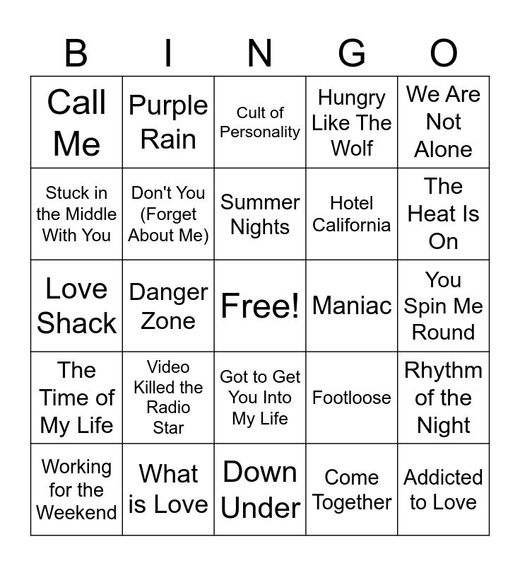 This bingo card has a free space and 36 words: We Don't Talk Anymore, Greased Lightnin', Let's Hear It For The Boy, Don't You (Forget About Me), Footloose, The Time of My Life, Summer Nights, Holding Out For A Hero, We Are Not Alone, Hungry Eyes, Danger Zone, Hungry Like The Wolf, Rebel Yell, Maniac, The Heat Is On, Call Me, You're The One That I Want, Video Killed the Radio Star, Addicted to Love, Cult of Personality, You Spin Me Round, Rhythm of the Night, What is Love, Working for the Weekend, Down Under, Purple Rain, Love Shack, My Prerogative, Hotel California, Stuck in the Middle With You, Jungle Boogie, Stayin' Alive, Come Together, Got to Get You Into My Life, You Really Got Me and Beauty School Dropout.