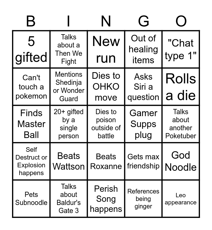 This bingo card has 38 words: Free!, Pat makes me laugh, Mentions One Piece, Mentions Shedinja or Wonder Guard, God Noodle, Beats Wattson, Dies to OHKO move, Accidentally KOs a wild mon, "Chat type 1", Asks Siri a question, 20+ gifted by a single person, Out of healing items, Dies to poison outside of battle, Talks about another Poketuber, Can't touch a pokemon, Self Destruct or Explosion happens, Uses a Mega Evolution, New run, Destiny Bond happens, Gamer Supps plug, 5 gifted, Talks about Baldur's Gate 3, Rolls a die, Pets Subnoodle, Nickname is claimed, Perish Song happens, Leo appearance, Camera zoom, Controller stops working, Wheel Spin, Says something in Japanese, Beats Roxanne, References being ginger, Talks about a Then We Fight, Rolls Huge Power or Pure Power, Gets max friendship, Finds Master Ball and "Honesty and integrity".