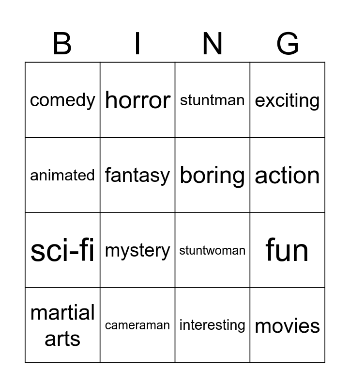 This bingo card has 23 words: movies, genre, action, adventure, animated, comedy, fantasy, horror, martial arts, romantic, mystery, sci-fi, actor, actress, cameraman, director, stuntman, stuntwoman, boring, fun, exciting, interesting and scary.