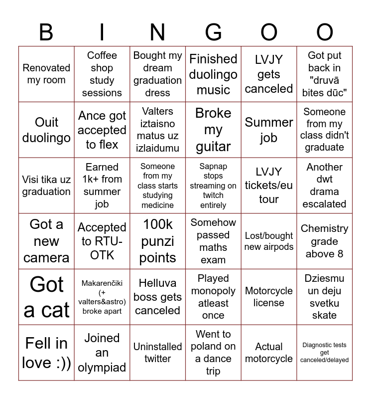 This bingo card has 36 words: Played monopoly atleast once, Helluva boss gets canceled, Went to poland on a dance trip, Ouit duolingo, Got a new camera, Sapnap stops streaming on twitch entirely, Ance got accepted to flex, Uninstalled twitter, LVJY gets canceled, Motorcycle license, Someone from my class didn't graduate, Finished duolingo music, Dziesmu un deju svetku skate, Earned 1k+ from summer job, Broke my guitar, Renovated my room, Got a cat, LVJY tickets/eu tour, Visi tika uz graduation, Bought my dream graduation dress, Someone from my class starts studying medicine, Accepted to RTU-OTK, Somehow passed maths exam, 100k punzi points, Lost/bought new airpods, Coffee shop study sessions, Summer job, Joined an olympiad, Valters iztaisno matus uz izlaidumu, Got put back in "druvā bites dūc", Diagnostic tests get canceled/delayed, Fell in love :)), Chemistry grade above 8, Another dwt drama escalated, Makarenčiki (+ valters&astro) broke apart and Actual motorcycle.
