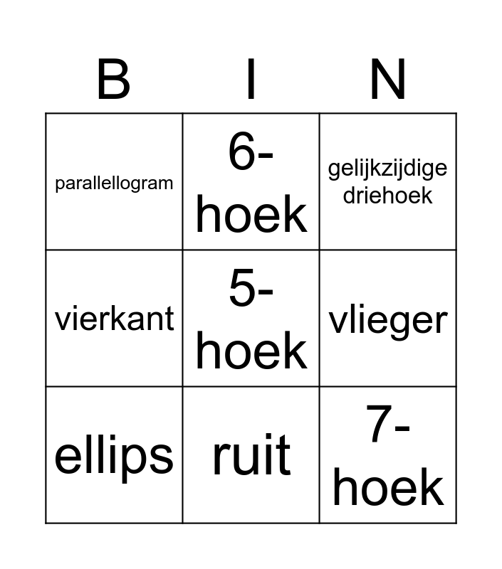 This bingo card has 17 words: rechthoek, gelijkbenige driehoek, gelijkzijdige driehoek, parallellogram, trapezium, vierkant, cirkel, ellips, ruit, vlieger, driehoek, rechthoekige driehoek, 5-hoek, 6-hoek, 7-hoek, lijnsymmetrisch and draaisymmetrisch.
