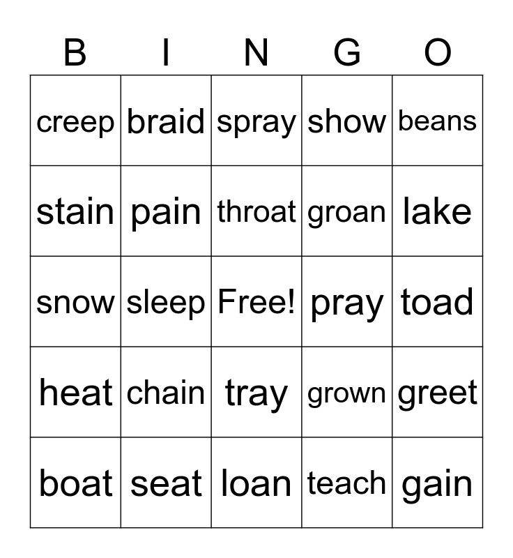 This bingo card has a free space and 24 words: chain, seat, throat, boat, beans, creep, stain, braid, pray, tray, groan, snow, grown, greet, pain, teach, toad, spray, lake, sleep, gain, heat, show and loan.