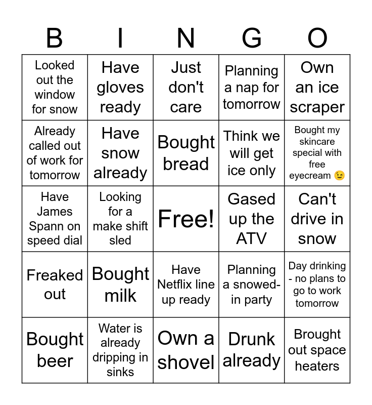 This bingo card has a free space and 25 words: Bought milk, Own a shovel, Bought bread, Bought beer, Own an ice scraper, Looked out the window for snow, Already called out of work for tomorrow, Have gloves ready, Gased up the ATV, Have Netflix line up ready, Think we will get ice only, Have James Spann on speed dial, Planning a snowed-in party, Day drinking - no plans to go to work tomorrow, Have snow already, Have never seen more than 2" of snow, Can't drive in snow, Just don't care, Bought my skincare special with free eyecream 😉, Looking for a make shift sled, Brought out space heaters, Water is already dripping in sinks, Freaked out, Planning a nap for tomorrow and Drunk already.