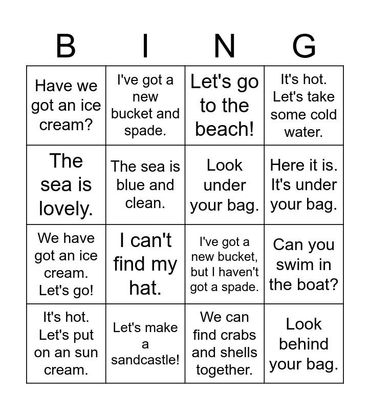 This bingo card has 16 words: Let's make a sandcastle!, Can you swim in the boat?, Let's go to the beach!, Have we got an ice cream?, We have got an ice cream. Let's go!, I've got a new bucket and spade., I've got a new bucket, but I haven't got a spade., We can find crabs and shells together., The sea is lovely., The sea is blue and clean., It's hot. Let's put on an sun cream., It's hot. Let's take some cold water., I can't find my hat., Here it is. It's under your bag., Look under your bag. and Look behind your bag..
