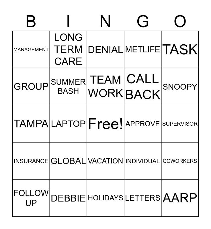 This bingo card has a free space and 24 words: GLOBAL, DEBBIE, TEAM WORK, FOLLOW UP, TASK, MANAGEMENT, GROUP, LONG TERM CARE, APPROVE, VACATION, CALL BACK, TAMPA, INDIVIDUAL, COWORKERS, SUMMER BASH, LETTERS, SUPERVISOR, DENIAL, SNOOPY, LAPTOP, AARP, INSURANCE, METLIFE and HOLIDAYS.