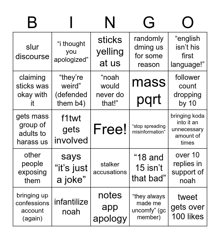 This bingo card has a free space and 24 words: says “it’s just a joke”, infantilize noah, “noah would never do that!”, bringing up confessions account (again), “english isn’t his first language!”, slur discourse, claiming sticks was okay with it, “i thought you apologized”, “stop spreading misinformation”, stalker accusations, mass pqrt, gets mass group of adults to harass us, “18 and 15 isn’t that bad”, over 10 replies in support of noah, “they’re weird” (defended them b4), “they always made me uncomfy” (gc member), bringing koda into it an unnecessary amount of times, sticks yelling at us, follower count dropping by 10, f1twt gets involved, tweet gets over 100 likes, other people exposing them, randomly dming us for some reason and notes app apology.
