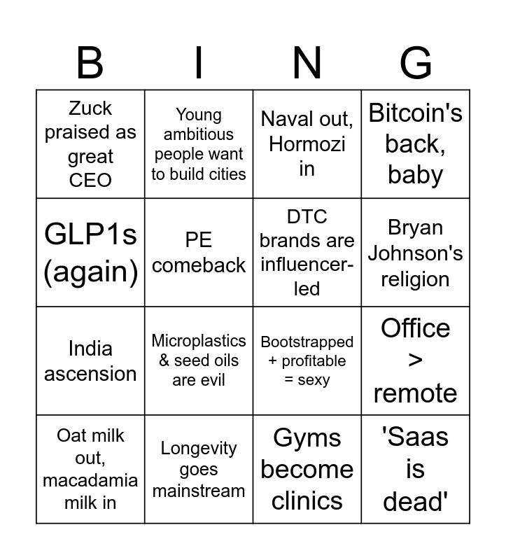 This bingo card has 16 words: Longevity goes mainstream, Office > remote, Naval out, Hormozi in, Zuck praised as great CEO, India ascension, Young ambitious people want to build cities, Bootstrapped + profitable = sexy, Gyms become clinics, GLP1s (again), PE comeback, Oat milk out, macadamia milk in, Bitcoin's back, baby, Microplastics & seed oils are evil, Bryan Johnson's religion, DTC brands are influencer-led and 'Saas is dead'.