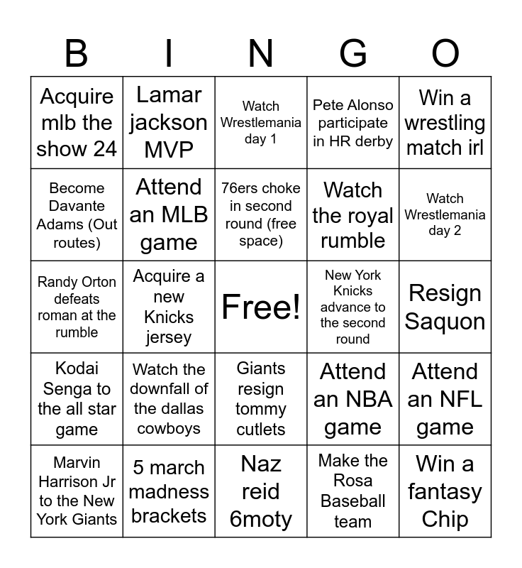 This bingo card has a free space and 25 words: Watch the downfall of the dallas cowboys, Naz reid 6moty, 76ers choke in second round (free space), Marvin Harrison Jr to the New York Giants, Win a wrestling match irl, Acquire mlb the show 24, Become Davante Adams (Out routes), Lamar jackson MVP, New York Knicks advance to the second round, Giants resign tommy cutlets, Watch the royal rumble, Randy Orton defeats roman at the rumble, Attend an NBA game, Attend an NFL game, Attend an MLB game, Attend an MLB game and stay full time, Resign Saquon, Watch Wrestlemania day 1, Watch Wrestlemania day 2, Acquire a new Knicks jersey, Win a fantasy Chip, 5 march madness brackets, Kodai Senga to the all star game, Pete Alonso participate in HR derby and Make the Rosa Baseball team.