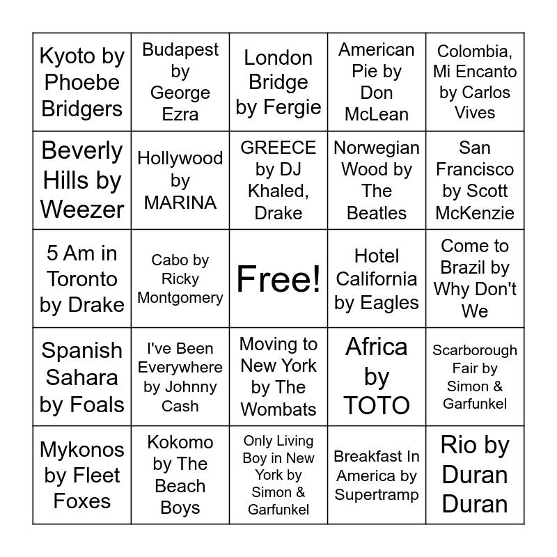 This bingo card has a free space and 75 words: Malibu by Miley Cyrus, Marrakesh Express by Crosby, Stills & Nash, London Bridge by Fergie, Party In The U.S.A. by Miley Cyrus, Panama by Van Halen, Fire In Cairo by The Cure, Atlantic City by Bruce Springsteen, Chinatown by Bleachers, Bruce Springsteen, Big in Japan by Alphaville, Amsterdam by Gregory Alan Isakov, Rotterdam (Or Anywhere) by The Beautiful South, Californication by Red Hot Chili Peppers, GREECE by DJ Khaled, Drake, Beverly Hills by Weezer, Walk Like an Egyptian by The Bangles, Cabo by Ricky Montgomery, Baghdad by Flo Perlin, Rio by Duran Duran, California Gurls by Katy Perry, Snoop Dogg, Colombia, Mi Encanto by Carlos Vives, 10am Gare du Nord by Keaton Henson, 5 Am in Toronto by Drake, Hollywood by MARINA, Budapest by George Ezra, American Pie by Don McLean, Antarctica by The Dreadnoughts, Rome by Phoenix, Australia by The Shins, Paris by Taylor Swift, Vienna by Billy Joel, King of Spain by Moxy Früvous, New York State of Mind by Billy Joel, Blue Hawaii by Elvis Presley, Africa by TOTO, San Francisco by Scott McKenzie, Norwegian Wood by The Beatles, Yakko's World by Animaniacs, This Is America by Childish Gambino, Come to Brazil by Why Don't We, Breakfast In America by Supertramp, Rivers of Babylon by Boney M., Funky Town by Lipps Inc., The Girl From Ipanema by Astrud Gilberto, London Boy by Taylor Swift, Havana by Camila Cabello, Young Thug, Berlin by Fenne Lily, Mykonos by Fleet Foxes, Kyoto by Phoebe Bridgers, Down in New Orleans by Dr. John, Pompeii by Bastille, Georgia by Vance Joy, Moving to New York by The Wombats, I Took A Pill In Ibiza by Mike Posner, Seeb, Werewolves of London by Warren Zevon, Sweet Home Alabama by Lynyrd Skynyrd, Haiti by Arcade Fire, Waterloo by ABBA, Margaritaville by Jimmy Buffett, Take Me Home, Country Roads by John Denver, Kashmir by Led Zeppelin, I've Been Everywhere by Johnny Cash, Carolina in My Mind by James Taylor, Canada's Really Big by Arrogant Worms, The Final Countdown by Europe, Istanbul (Not Constantinople) by They Might Be Giants, Hotel California by Eagles, The Last Saskatchewan Pirate by Arrogant Worms, Calgary by Bon Iver, Devil Went Down to Georgia by Charlie Daniels Band, Scarborough Fair by Simon & Garfunkel, Spanish Sahara by Foals, Kokomo by The Beach Boys, Mexican Girl by Smokie, Only Living Boy in New York by Simon & Garfunkel and Empire State Of Mind by JAY-Z, Alicia Keys.