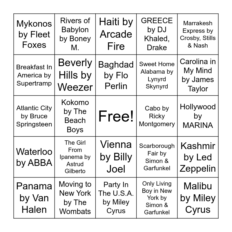 This bingo card has a free space and 75 words: American Pie by Don McLean, Paris by Taylor Swift, Haiti by Arcade Fire, Hotel California by Eagles, Funky Town by Lipps Inc., Pompeii by Bastille, I Took A Pill In Ibiza by Mike Posner, Seeb, Istanbul (Not Constantinople) by They Might Be Giants, Werewolves of London by Warren Zevon, San Francisco by Scott McKenzie, Devil Went Down to Georgia by Charlie Daniels Band, Empire State Of Mind by JAY-Z, Alicia Keys, Baghdad by Flo Perlin, Breakfast In America by Supertramp, Walk Like an Egyptian by The Bangles, Kokomo by The Beach Boys, Calgary by Bon Iver, Malibu by Miley Cyrus, Amsterdam by Gregory Alan Isakov, Marrakesh Express by Crosby, Stills & Nash, Margaritaville by Jimmy Buffett, Atlantic City by Bruce Springsteen, Beverly Hills by Weezer, Rivers of Babylon by Boney M., GREECE by DJ Khaled, Drake, Kyoto by Phoebe Bridgers, The Last Saskatchewan Pirate by Arrogant Worms, 5 Am in Toronto by Drake, Yakko's World by Animaniacs, Rome by Phoenix, King of Spain by Moxy FrβΒΊvous, Spanish Sahara by Foals, Budapest by George Ezra, Scarborough Fair by Simon & Garfunkel, Carolina in My Mind by James Taylor, Sweet Home Alabama by Lynyrd Skynyrd, Mexican Girl by Smokie, Canada's Really Big by Arrogant Worms, Hollywood by MARINA, Only Living Boy in New York by Simon & Garfunkel, Come to Brazil by Why Don't We, Havana by Camila Cabello, Young Thug, Take Me Home, Country Roads by John Denver, Down in New Orleans by Dr. John, California Gurls by Katy Perry, Snoop Dogg, Big in Japan by Alphaville, Panama by Van Halen, Mykonos by Fleet Foxes, Africa by TOTO, Fire In Cairo by The Cure, Australia by The Shins, Vienna by Billy Joel, Rio by Duran Duran, Georgia by Vance Joy, Norwegian Wood by The Beatles, I've Been Everywhere by Johnny Cash, Californication by Red Hot Chili Peppers, Antarctica by The Dreadnoughts, Chinatown by Bleachers, Bruce Springsteen, Colombia, Mi Encanto by Carlos Vives, The Girl From Ipanema by Astrud Gilberto, The Final Countdown by Europe, London Bridge by Fergie, Blue Hawaii by Elvis Presley, Rotterdam (Or Anywhere) by The Beautiful South, Cabo by Ricky Montgomery, 10am Gare du Nord by Keaton Henson, Berlin by Fenne Lily, New York State of Mind by Billy Joel, Kashmir by Led Zeppelin, Waterloo by ABBA, Moving to New York by The Wombats, London Boy by Taylor Swift, Party In The U.S.A. by Miley Cyrus and This Is America by Childish Gambino.
