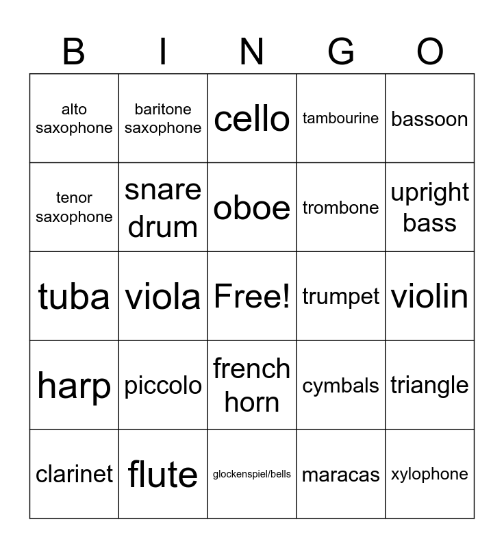 This bingo card has a free space and 24 words: piccolo, flute, oboe, clarinet, bassoon, alto saxophone, tenor saxophone, baritone saxophone, trumpet, french horn, trombone, tuba, cymbals, triangle, snare drum, maracas, violin, cello, upright bass, viola, xylophone, harp, tambourine and glockenspiel/bells.