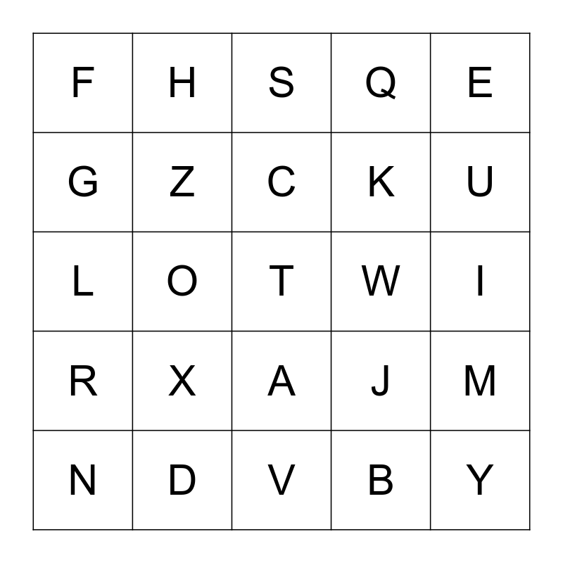 This bingo card has 26 words: A, B, C, D, E, F, G, H, I, J, K, L, M, N, O, P, Q, R, S, T, U, V, W, X, Z and Y.