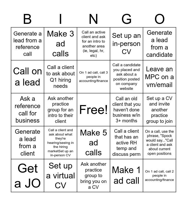 This bingo card has a free space and 24 words: Call a client and ask about what they're hearing/seeing in the hiring marketSet up an in-person CV, Set up a virtual CV, On 1 ad call, call 3 people in accounting/finance, Get a JO, Generate a lead from a candidate, Generate a lead from a reference call, Call on a lead, Make 3 ad calls, Call an old client that you haven't done business w/in 3+ months, Make 5 ad calls, Call a candidate you placed and ask about a position posted on company website, Ask a reference call for business, Call a client that has an active RH temp and discuss perm, On a call, use the phrase, "Spock would say..."Call a client and ask about current open positions, Call a client to ask about Q1 hiring needs, Make 1 ad call, Set up a CV and invite another practice group to join, Call an active client and ask for an intro to another area (ie, legal, hr, etc), Leave an MPC on a vm/email, Ask another practice group for an intro to their client, On 1 ad call, call 2 people in accounting/finance, Generate a lead from a client, Set up an in-person CV and Ask another practice group to bring you on a CV.