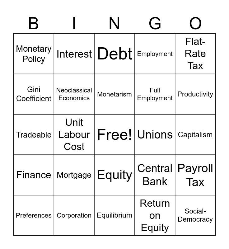 This bingo card has a free space and 193 words: Absolute Poverty, Investment, Allocative Efficiency, Automatic Stabilizers, Balanced Budget, Balanced Budget Laws, Banking Cycle, Banks, Barter, Bond, Capital, Capital Adequacy, Capital Flight, Capital Gain, Capitalism, Carbon Tax, Central Bank, Central Planning, Classical Economics, Commodity, Comparative Advantage, Competition, Consumer Price Index, Consumption, Corporation, Cost of Job Loss, Counter-Cyclical Policies, Credit, Debt, Debt Burden, Deficit, Defined Benefit Pensions, Defined Contribution Pensions, Deflation, Demand-Constrained, Depreciation, Depression, Derivatives, Development, Discretionary Fiscal Policy, Distribution, Dividends, Economic Growth, Economies of Scale, Effective Demand, Employment, Employment Rate, Enclosures, Environmental Taxes, Equilibrium, Equity, Exchange Rate, Exports, Externalities, Factors of Production, Feudalism, Final Products, Finance, Financialization, Fiscal Policy, Fixed Capital, Flat-Rate Tax, Foreign Direct Investment, Foreign Exchange, Formal Economy, Fractional Reserve System, Free Trade Agreements, Full Employment, General Equilibrium, Gini Coefficient, Globalization, Goods, Government Production, Gross Domestic Product, Gross Domestic Product, Deflator, Gross Domestic Product, Per Capita, Heterodox Economics, Hoarding, Households, Hyper-Inflation, Imports, Industrial Policy, Inequality, Inflation, Informal Economy, Innovation, Institutionalist Economics, Interest, Intermediate Products, International Monetary Fund, Investment, Joint Stock, Labour Discipline, Labour Extraction, Labour Force, Labour Intensity, Labour Market Segmentation, Labour Supply, Long Waves, Machinery and Equipment, Macroeconomics, Managers, Market Income, Market Socialism, Mercantilism, Microeconomics, Migration, Monetarism, Monetary Policy, Monetary Targeting, Money, Mortgage, Multinational Corporation, Multiplier, Mutual Fund, Natural Monopoly, Natural Rate of Unemployment, Neoclassical Economics, Neoliberalism, Nominal GDP, Non-Tradeable, Paradox of Thrift, Participation Rate, Pay-As-You-Go Pension, Payroll Tax, Pensions, Perfect Competition, Physical Capital, Pollution, Post-Keynesian Economics, Poverty, Poverty Rate, Poverty Rate, Preferences, Price Level, Primary Products, Private Equity, Product Markets, Production, Production, for Profit, Productivity, Profit, Program Spending, Progressive Tax, Public Goods, Public Investment, Public-Private Partnerships (PPPs), Real GDP, Real Interest Rate, Real Wages, Recession, Recovery, Regressive Tax, Relative Poverty, Relative Price, Reproduction, Retained Earnings, Return on Equity, Sales Tax, Saving, Securitization, Services, Shares, Slavery, Social-Democracy, Socialism, Speculation, Stock Market, Structuralist Economics, Structures, Supply-Constrained, Surplus, Surplus, Economic, Surplus, Government, Sustainability, Tariff, Taxes, Technology, Terms of Trade, Tradeable, Transfer Payments, Underdevelopment, Unemployment, Unemployment Rate, Unions, Unit Labour Cost, User Fees, Value Added, Wage Labour, Wealth Tax, Working Capital, World Bank and World Trade Organization.