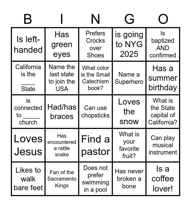 This bingo card has 30 words: Fan of the Sacramento Kings, Does not have any pets, Had/has braces, What could you eat forever?, Is left-handed, Prefers Crocks over Shoes, Name the last state to join the USA, Find a pastor, Loves the snow, Does not prefer swimming in a pool, What is the State capital of California?, Can use chopsticks, Has never broken a bone, Is a coffee lover!, Has a summer birthday, Born in a state OUTSIDE California, What is your favorite fruit?, Loves Jesus, Has encountered a rattle snake, Is baptized AND confirmed, is connected to _____ church, Make the "sign of the cross", Has green eyes, Name a Superhero, California is the ____ State, is going to NYG 2025, Can play musical instrument, Likes to walk bare feet, What color is the Small Catechism book? and Is the oldest/only child.