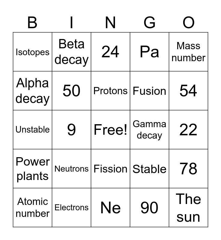 This bingo card has a free space and 24 words: Neutrons, Electrons, Protons, Atomic number, Mass number, Isotopes, Alpha decay, Beta decay, Gamma decay, Fission, Fusion, Unstable, Stable, 78, 50, 90, 22, 24, 54, 9, The sun, Power plants, Pa and Ne.