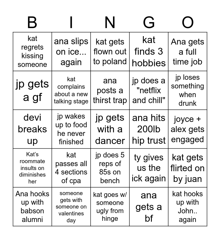 This bingo card has a free space and 44 words: ana moves out, kat hooks up with John.. again, Jeanpi gets with someone taller than him, Ana hooks up with babson alumni, justin gets a gf, ana gets a bf, kat gets flown out to poland, ana gets a gf, Ana gets a full time job, someone gets with someone on valentines day, kat finds 3 hobbies, ana hits 200lb hip trust, jp does 5 reps of 85s on bench, kat passes all 4 sections of cpa, jp passes all 4 sections of cpa, kat goes w/ someone ugly from hinge, colby hits 500k subs, devi breaks up, kat, ana + jp move in together, jp loses something when drunk, ana slips on ice... again, jp destroys something when drunk, jp makes out w someone ugly, kat regrets kissing someone, justin acts rich, joyce + alex gets engaged, joyce + alex gets broken up, ians breaks up with his girl, ty gives us the ick again, Kat’s roommate insults on diminishes her, a man shades ana on ig, kat gets flirted on by juan, kat gets a bf, jp eats 4500k cals in 1night, jp wakes up to food he never finished, ana goes viral on tiktok, ana gets on raya, kat gets on raya, ana posts a thirst trap, jp gets a gf, jp does a "netflix and chill", she meets jp parents, kat complains about a new talking stage and jp gets with 4 girls.