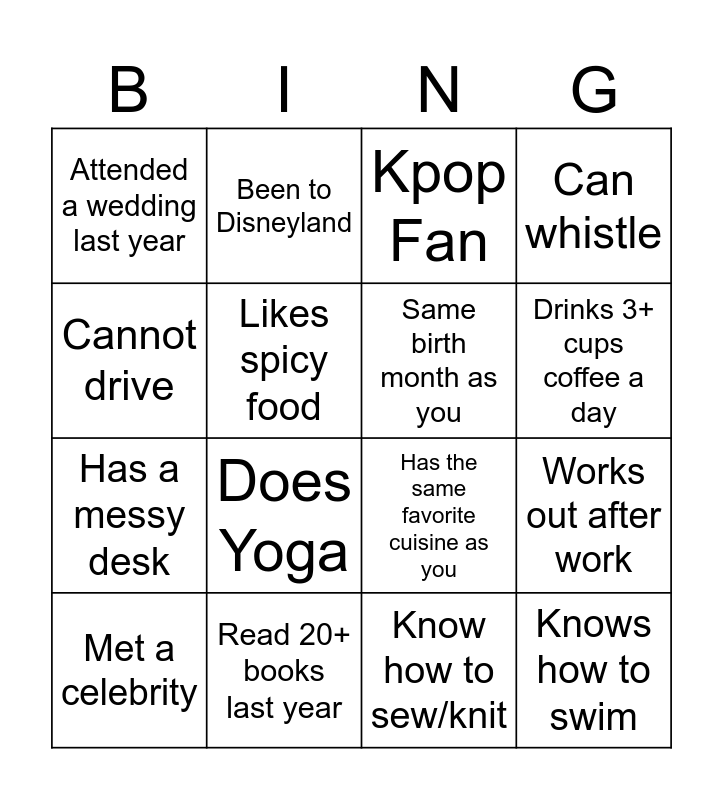 This bingo card has 16 words: Read 20+ books last year, Works out after work, Kpop Fan, Attended a wedding last year, Has a messy desk, Been to Disneyland, Has the same favorite cuisine as you, Know how to sew/knit, Cannot drive, Likes spicy food, Met a celebrity, Can whistle, Does Yoga, Drinks 3+ cups coffee a day, Same birth month as you and Knows how to swim.
