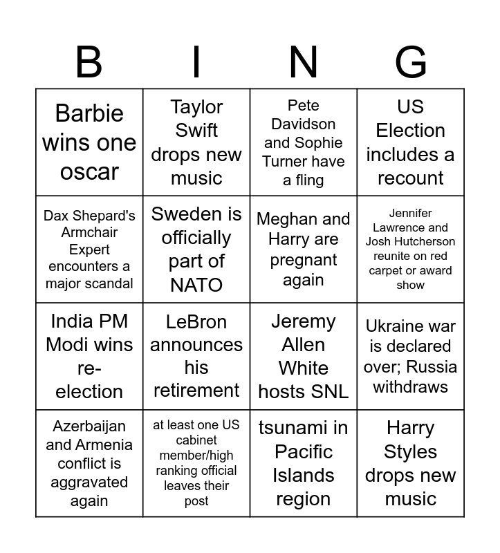 This bingo card has 16 words: at least one US cabinet member/high ranking official leaves their post, Ukraine war is declared over; Russia withdraws, Pete Davidson and Sophie Turner have a fling, Barbie wins one oscar, India PM Modi wins re-election, Taylor Swift drops new music, Jeremy Allen White hosts SNL, tsunami in Pacific Islands region, Dax Shepard's Armchair Expert encounters a major scandal, Sweden is officially part of NATO, Azerbaijan and Armenia conflict is aggravated again, US Election includes a recount, LeBron announces his retirement, Jennifer Lawrence and Josh Hutcherson reunite on red carpet or award show, Meghan and Harry are pregnant again and Harry Styles drops new music.
