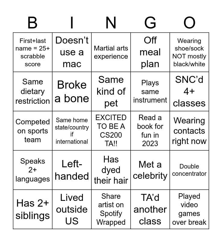 This bingo card has a free space and 24 words: Left-handed, Lived outside US, Same kind of pet, Has 2+ siblings, Wearing shoe/sock NOT mostly black/white, First+last name = 25+ scrabble score, Same dietary restriction, Doesn’t use a mac, Read a book for fun in 2023, Has dyed their hair, Plays same instrument, Competed on sports team, Met a celebrity, Double concentrator, Broke a bone, TA’d another class, Wearing contacts right now, Martial arts experience, SNC’d 4+ classes, Same home state/country if international, Played video games over break, Speaks 2+ languages, Off meal plan and Share artist on Spotify Wrapped.