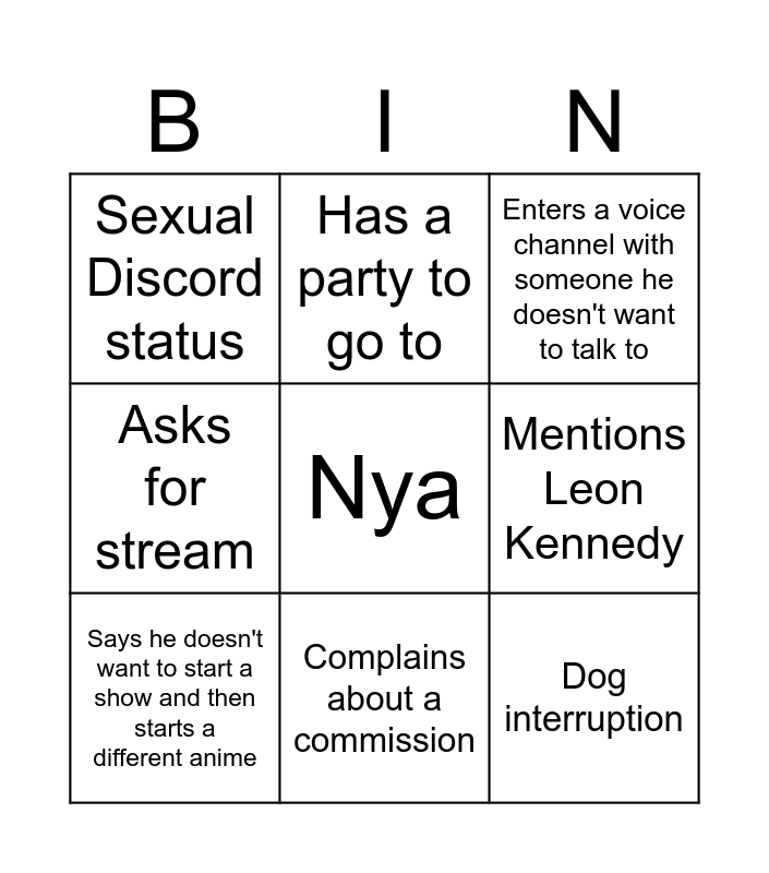 This bingo card has a free space and 8 words: Mentions Leon Kennedy, Enters a voice channel with someone he doesn't want to talk to, Has a party to go to, Says he doesn't want to start a show and then starts a different anime, Sexual Discord status, Dog interruption, Asks for stream and Complains about a commission.