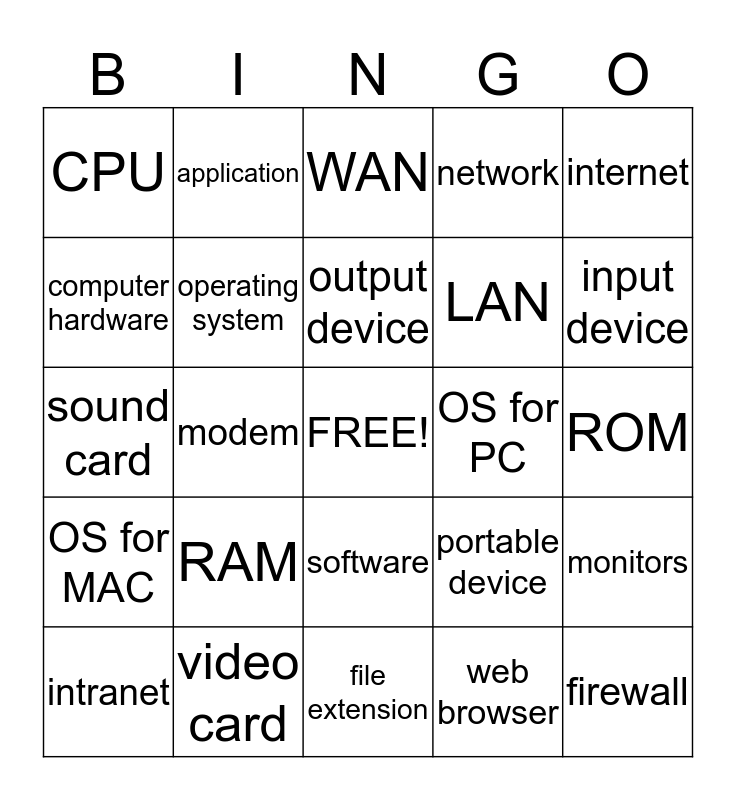 This bingo card has a free space and 24 words: RAM, video card, output device, intranet, internet, CPU, computer hardware, application, OS for PC, software, LAN, sound card, portable device, monitors, operating system, web browser, ROM, WAN, input device, modem, firewall, OS for MAC, network and file extension.