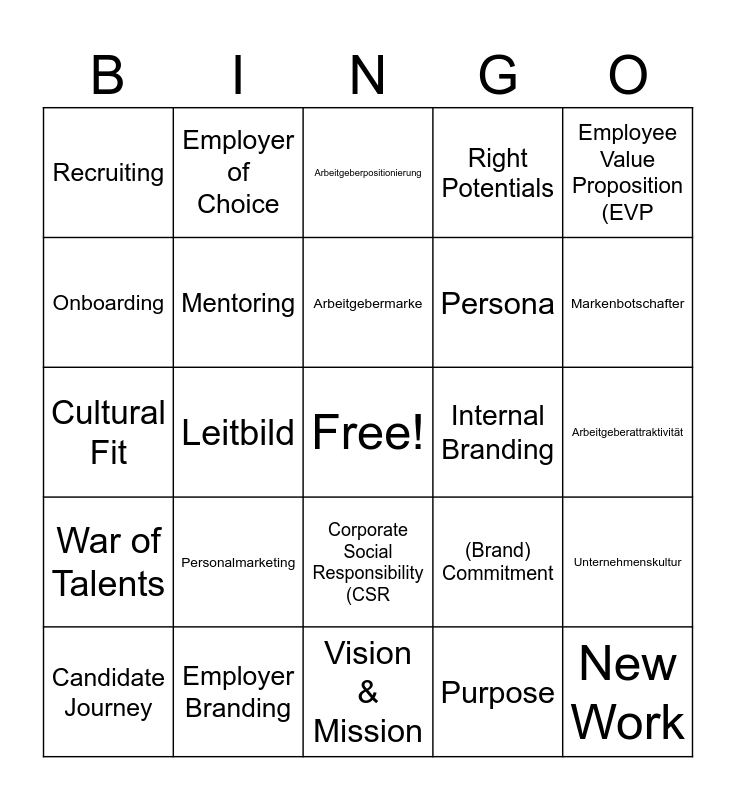 This bingo card has a free space and 24 words: Personalmarketing, Employer Branding, Arbeitgebermarke, Candidate Journey, Employee Value Proposition (EVP, Recruiting, Onboarding, Employer of Choice, Internal Branding, Corporate Social Responsibility (CSR, Persona, Cultural Fit, (Brand) Commitment, Unternehmenskultur, Mentoring, Purpose, Arbeitgeberattraktivität, Arbeitgeberpositionierung, Markenbotschafter, Leitbild, New Work, War of Talents, Right Potentials and Vision & Mission.