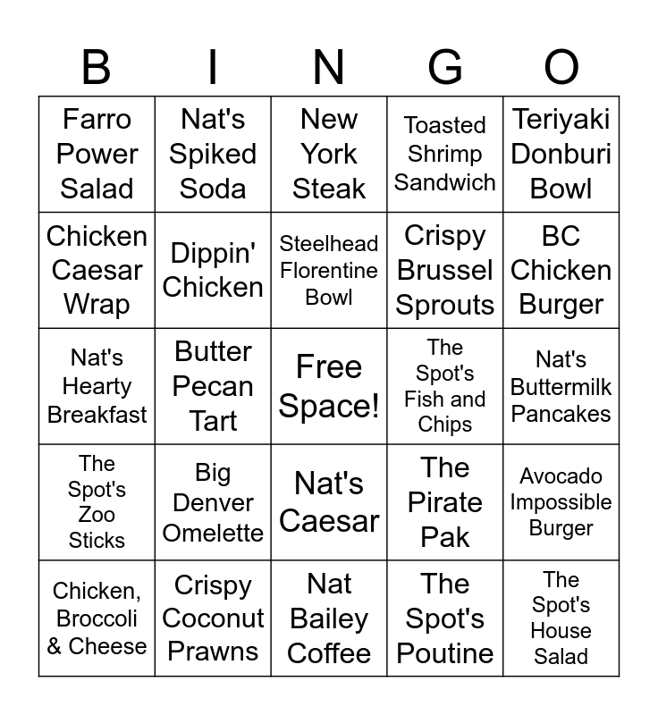 This bingo card has a free space and 59 words: Cheesy Bacon Perogies, Crispy Coconut Prawns, Nat's Dry Ribs, The Spot's Zoo Sticks, The Spot's Poutine, Southwest Chicken Quesadilla, Dippin' Chicken, Signature Clam Chowder, Crispy Brussel Sprouts, White Spot Club, Toasted Shrimp Sandwich, Nat's Loaded Beef Dip, Chicken Caesar Wrap, Turkey, Bacon & Brie Dip, Buttermilk Chicken Cobb Salad, Farro Power Salad, The Spot's House Salad, Teriyaki Donburi Bowl, Garlic Prawn Spaghetti, Steelhead Florentine Bowl, The Spot's Fish and Chips, New York Steak, Chicken, Broccoli & Cheese, Avocado Impossible Burger, The Legendary, Bacon Cheddar Burger, Monty Mushroom Burger, Double Double, BC Chicken Burger, Brie & Mushroom Veggie Burger, Gochujang Chicken Burger, Pacific Northwest Steelhead Burger, Nat Bailey Lager, Nat Bailey Pale Ale, Nat's Spiked Soda, Twisted Bellini, White Spot's Berry Cheesecake, Butter Pecan Tart, Chocolate Walnut Truffle, Nat's Hearty Breakfast, BC Sunny Start, Big Denver Omelette, Nat's Buttermilk Pancakes, Turkey Avocado Breakfast Wrap, Cheesesteak Hash, Prawn & Avocado Bowl, Charred Tomato & Spinach Benedict, Avocado Queso Bowl, Nat's Caesar, Nat Bailey Coffee, Salted Caramel Cold Brew, Rosé Sangria Spritz, Berry Blast, Spiked Chocolate Espresso Shake, Sunset Red Sangria, The Pirate Pak, The Western Plate, The Classic Plate and "Can I actually get no slaw with that please?".