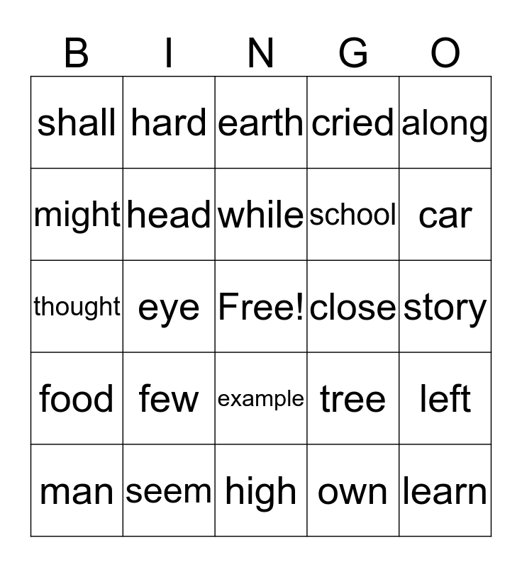 This bingo card has a free space and 24 words: few, seem, while, man, along, shall, might, hard, close, example, school, thought, tree, left, head, own, story, earth, car, eye, learn, food, cried and high.