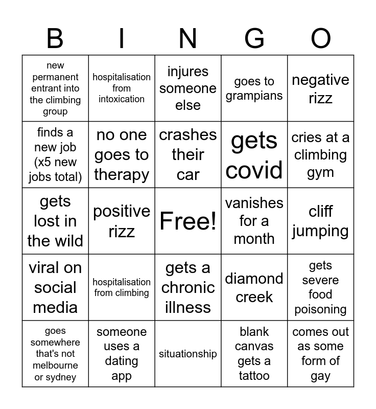 This bingo card has a free space and 24 words: hospitalisation from climbing, someone uses a dating app, crashes their car, goes somewhere that's not melbourne or sydney, negative rizz, new permanent entrant into the climbing group, finds a new job (x5 new jobs total), hospitalisation from intoxication, vanishes for a month, gets a chronic illness, gets covid, gets lost in the wild, diamond creek, gets severe food poisoning, no one goes to therapy, blank canvas gets a tattoo, cliff jumping, injures someone else, cries at a climbing gym, positive rizz, comes out as some form of gay, viral on social media, goes to grampians and situationship.
