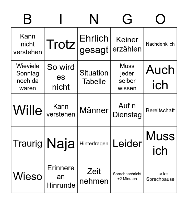 This bingo card has a free space and 24 words: Naja, Erinnere an Hinrunde, Situation Tabelle, Wieso, Nachdenklich, Kann nicht verstehen, Wieviele Sonntag noch da waren, Trotz, Auf n Dienstag, Hinterfragen, Muss jeder selber wissen, Wille, Leider, Muss ich, So wird es nicht, Sprachnachricht +2 Minuten, Bereitschaft, Ehrlich gesagt, Auch ich, Kann verstehen, … oder Sprechpause, Traurig, Keiner erzählen and Zeit nehmen.
